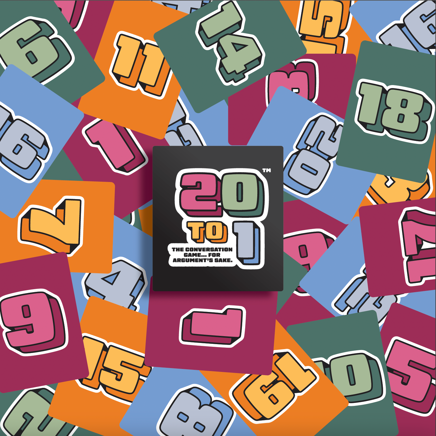 20 TO 1 IS A CONVERSATION CARD GAME DESIGNED TO ACTUALLY GET YOU TALKING WITH LIGHT HEARTED PROMPTS THAT SPARK EVERYTHING FROM PLAYFUL DEBATES TO MEANINGFUL CONVERSATIONS. GET CREATIVE, GET DEEP OR GET INTO A SMALL ARGUMENT... NO ANSWER IS OFF-LIMITS!